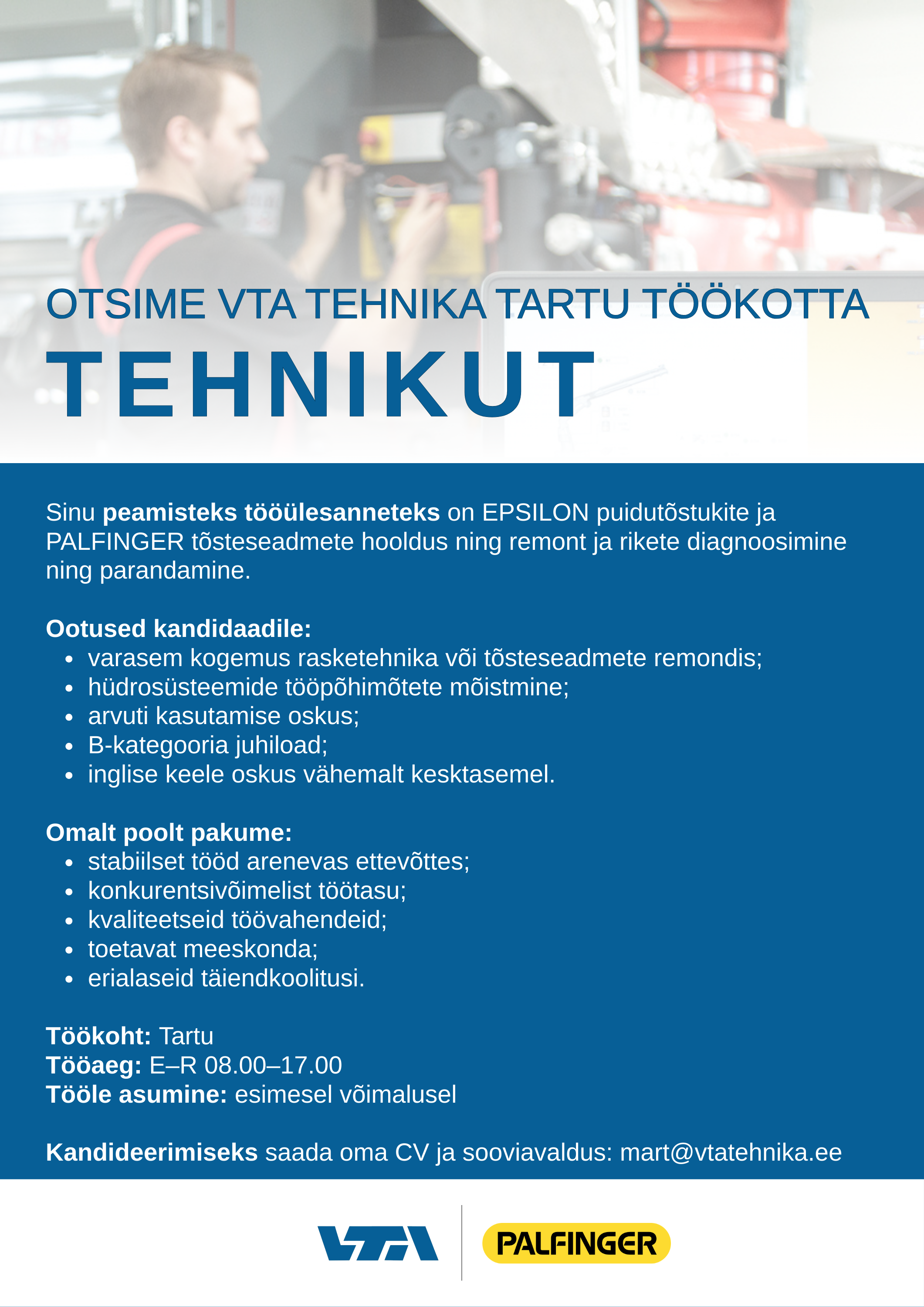 Oleme sertifitseeritud PALFINGER seadmete paigalduse, varuosa-, hoolduse- ja remondipartner Eestis. Meie mehaanikud osalevad erinevatel iga-aastastel tootjapoolsetel koolitustel, mis tagab pakutava teenuse kõrge kvaliteedi ja vastavuse tehase nõuetele. Nõuetekohane hooldus ja remont tagab seadmetele probleemivaba kasutuse ning tehasegarantii säilimise. Samuti tegeleme pealisehituse projekteerimise ja paigaldusega, lähtudes tootjanõuetest. Paigaldustel kasutame maksimaalselt...